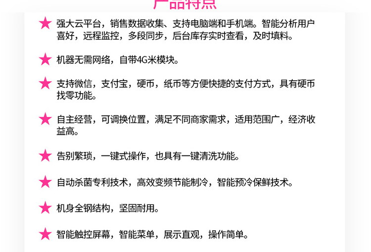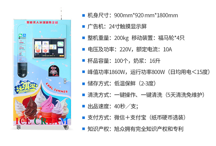 名稱ZS-01自動售賣冰淇淋機 電源220V 功率1800W 產量 尺寸高1800寬920深900 重量250KG 規格杯品容量:100個,奶漿:16升 其他1年(軟件部分終身)