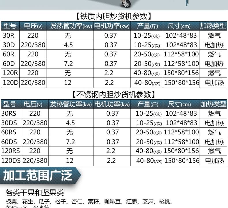 1.炒貨機有30型.60型.120型三種,每個型號各有燃氣加熱和電加熱兩種方式。