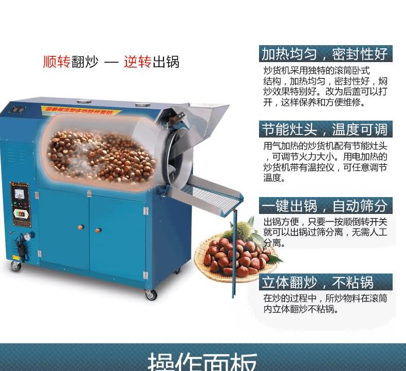 2.炒貨機采用獨特的滾筒臥式結構,加熱均勻,密封性好,燜炒效果特別好。同時結構上今年進行了改進,改為后蓋可以打開,這樣保養和維修十分方便。