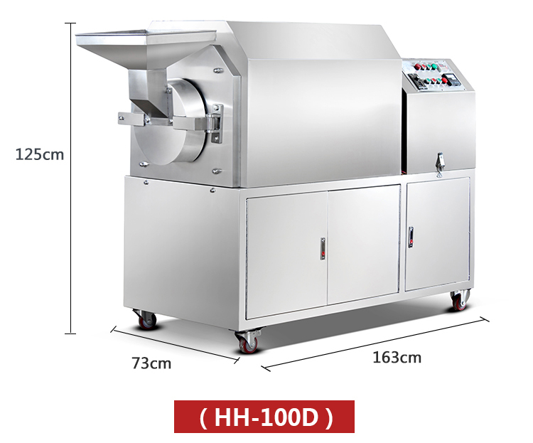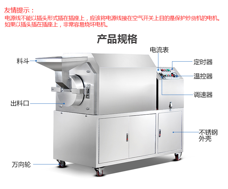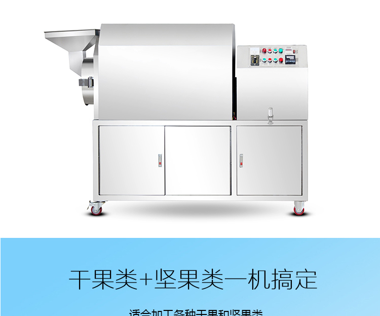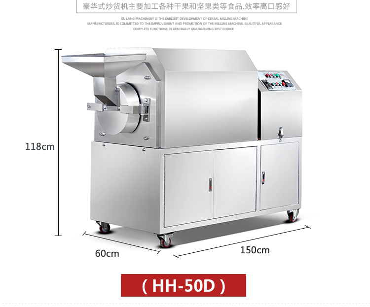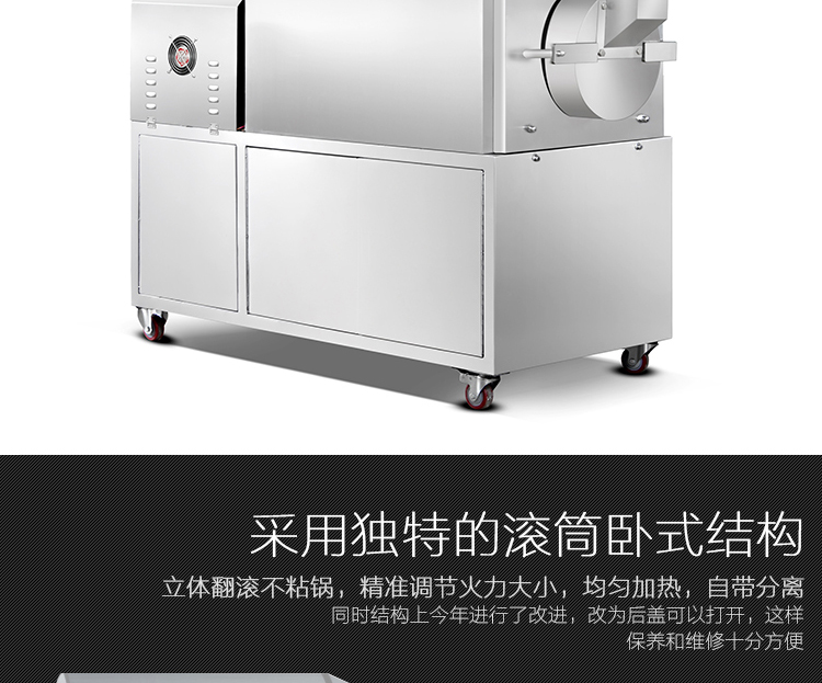 1.豪華炒貨機采用不銹鋼材質,獨特的滾筒臥式結構,加熱均勻,密封性好,燜炒效果好。同時結構上今年進行了改進,改為后蓋可以打開,這樣保養和維修十分方便,下料的地方增加漏斗,操作更方便!