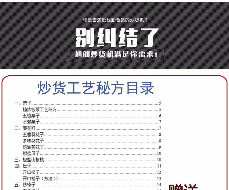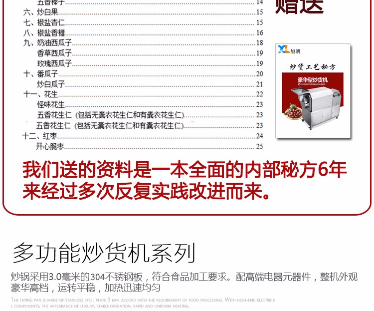 8.適合加工各種干果和堅果類,如;板栗、花生、瓜子、松籽、榛子、杏仁、菜籽、咖啡豆、紅棗、芝麻、核桃、各種豆類、麥類、米類等。適用于在食品加工廠、農貿市場、食品專賣店、連鎖店等處定點加工和經營,符合生產、創業致富的需要。