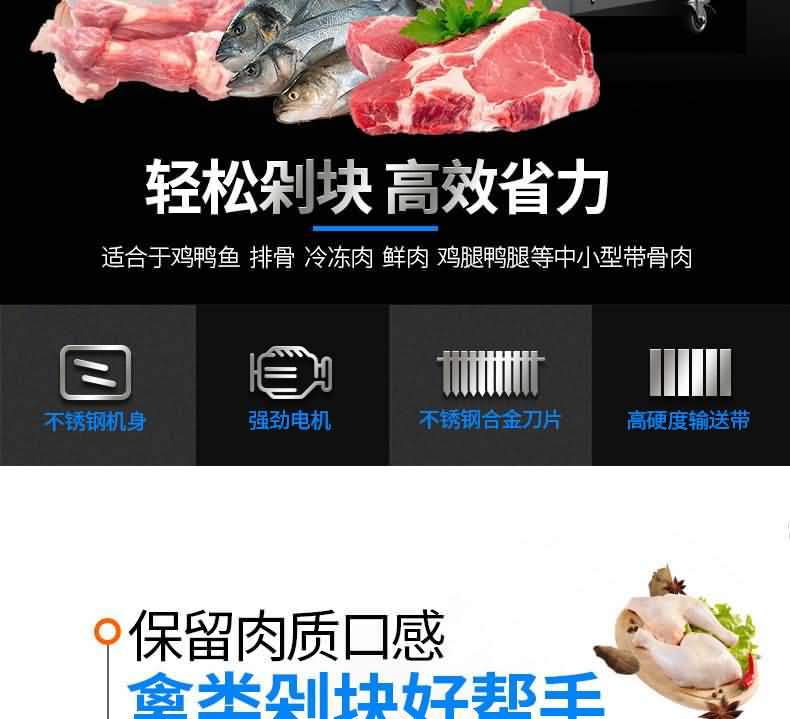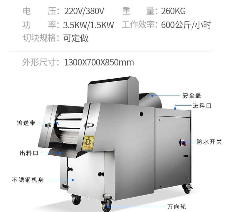 本機性價比高,模擬以手工切斷,切塊的原理采用“變速機構,自動送料”的結構研制而成。無損耗,采用特殊刀具刀塊,自動加厚履帶輸送,避免了切塊的危險性,使用安全性較高,切斷過程中不產生廢料,很大程度的保護了您的利益,節省人工,一機可抵多人工作,每小時可剁切600公斤,大大提高生產效率。廣泛用于大中小型食品加工廠、集體食堂、屠宰場、肉聯加工廠、超市等。適用于雞肉、鴨肉、魚,中小型動物骨頭、冷凍肉、鮮肉、凍雞、雞腿等帶骨肉類,可根據需要剁塊、段、條等,大小可調。