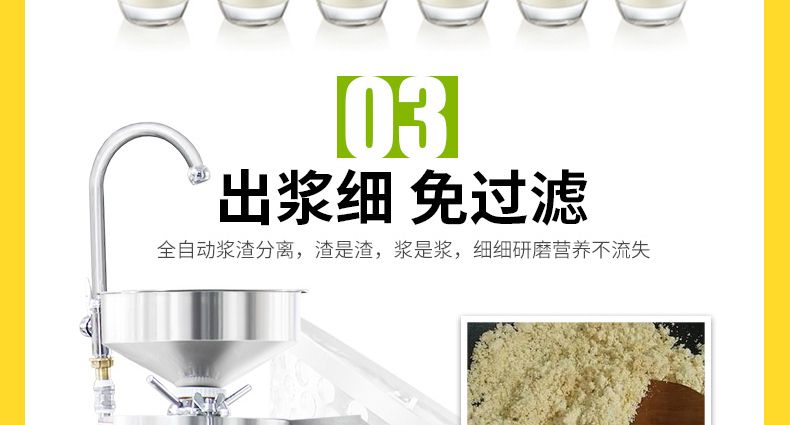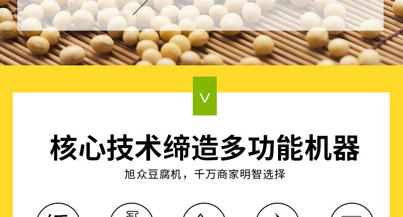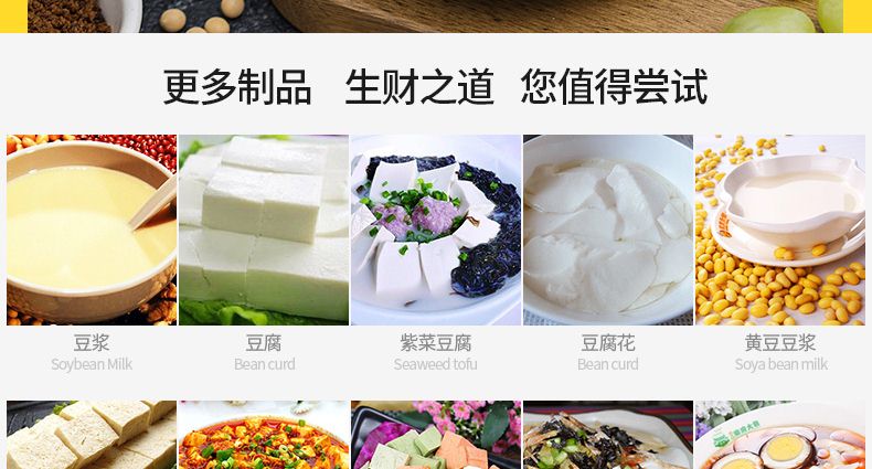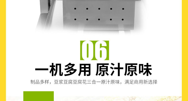 旭眾智能豆腐機專業(yè)生產(chǎn)數(shù)種豆?jié){制品,穩(wěn)定高效,采用磨漿分離機和煮漿機,出品率高于其它設備,擁有自動控制系統(tǒng),還增加數(shù)碼溫度控制儀,對煮漿隨時進行監(jiān)控,同時對不同產(chǎn)品所需溫度自行設定,當煮漿達到設定溫度時,具有自動提示及報警功能;整機采用不銹鋼材質制作,質量卓越,占地面積小,安裝簡單,工藝先進,一臺設備只需一人操作,省時、省力、省工。