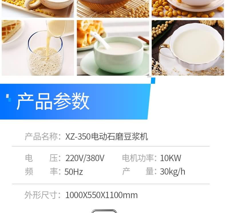 XZ-350電動石磨豆漿機,適用于制作豆漿;豆漿還含有鐵、鈣等礦物質,尤其是其所含的鈣,雖不及豆腐,但比其他任何乳類都高,非常適合于各種人群,包括老人、成年人和青少年等等。
