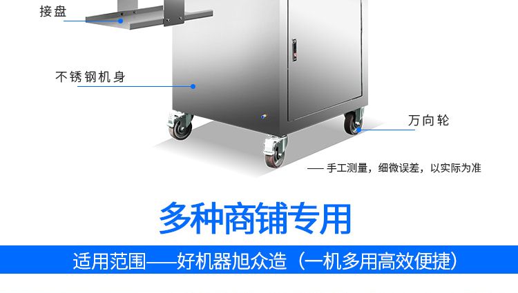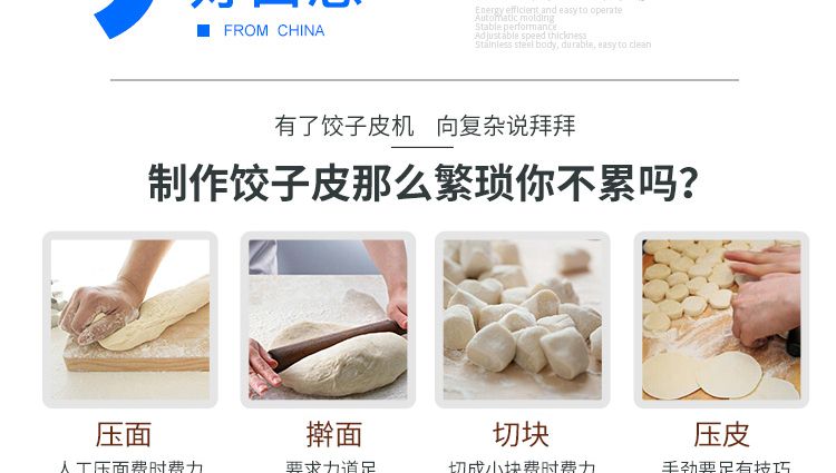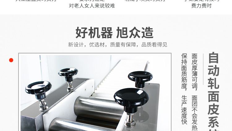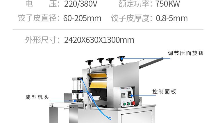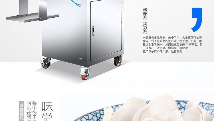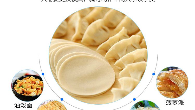 JGB-90型餃子皮機(jī)是我公司開發(fā)生產(chǎn)的先進(jìn)餃子皮生產(chǎn)設(shè)備。可以簡(jiǎn)單更換模具(可根據(jù)客戶定制不同形狀、尺寸的模具),本設(shè)備采用氣缸運(yùn)動(dòng)。本廠生產(chǎn)的90餃子皮機(jī),采用多道壓面輥壓面,壓面效果優(yōu)異,壓出的面皮筋道,進(jìn)一步提高所包出的餃子口感。