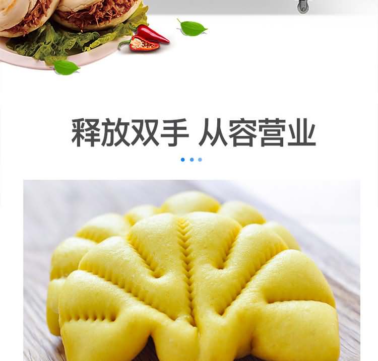 “荷葉夾”顧名思義便是其形狀似荷葉,蒸制后的成品小巧可愛,擺滿盤中不禁令人聯想到成片荷葉隨風搖擺并不時傳來陣陣荷香的美景而頓生涼意,非常適合在酷暑中作為點心。荷葉夾機,是一種把拌好的面團放在機器,加工制作荷葉夾的食品機械,可生產各種荷葉夾、蝴蝶夾、肉夾饃、也可生產刀切饅頭。