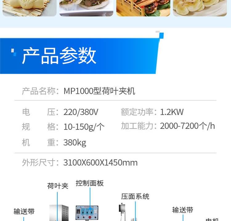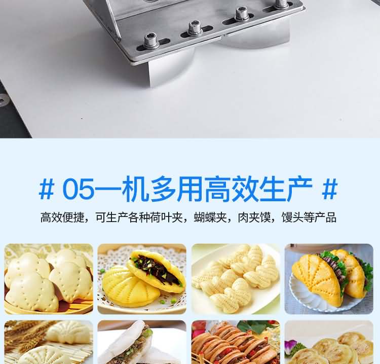 MP1000荷葉夾機,可生產各種荷葉夾、蝴蝶夾、肉夾饃、也可生產刀切饅頭等面食產品。適用于個體戶、食品廠、學校等各種工作場所,可滿足不同客戶群體。免費提供工藝技術。