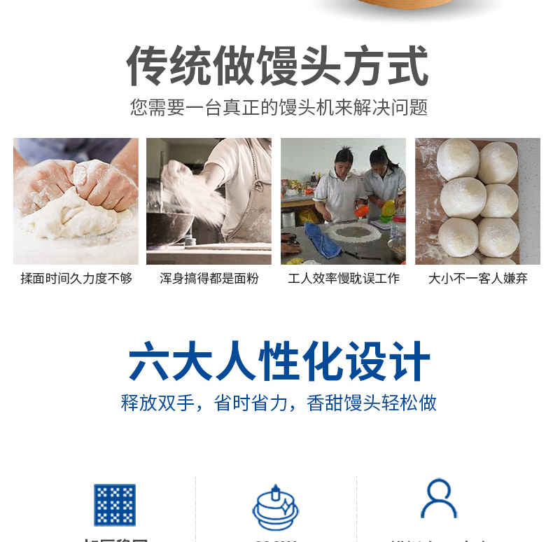 本機對面粉質量要求不高,適用于各種工作場所,工作效率相當于12-18個工人同時手工制作饅頭,真正的低投入、高收效、節省資源。
