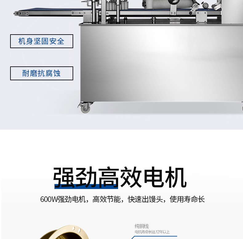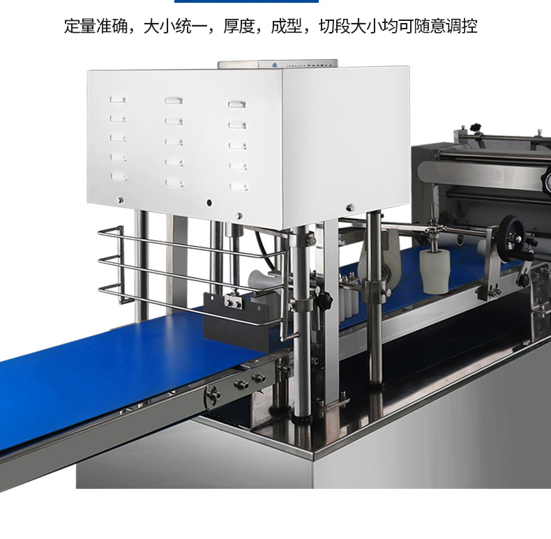 ?自動化程度高,定量準確,制品大小統一,饅頭面帶厚度、成型、切段大小均可隨意調控;