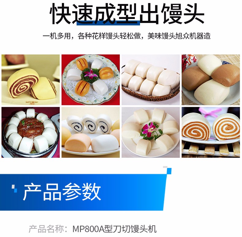 旭眾MP800A型刀切饅頭機采用高品質微電腦控制,人性化的控制面板,控制準確可靠,操作簡單,可生產各種刀切饅頭、花卷等面食產品。