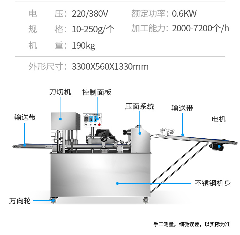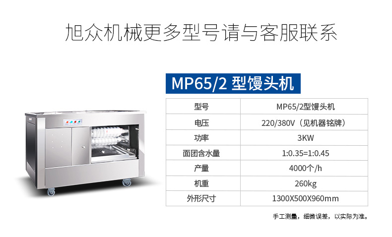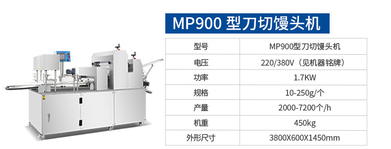 名稱MP800A型刀切饅頭機 電源220/380V(見機器銘牌) 功率0.6kw 產量2000-7200個/h 尺寸3300×560×1330mm 重量190kg 規格10-250g/個 其他