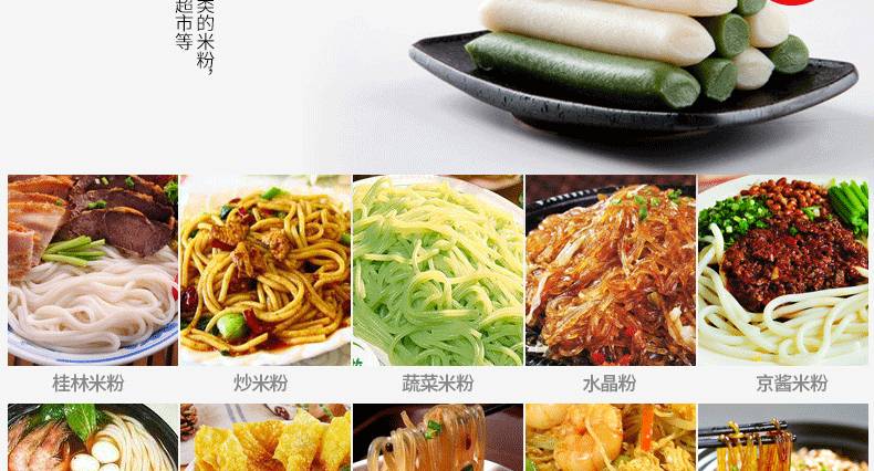 改進型不銹鋼米粉、米線專用機,裝有自動溫空裝置,整個生產過程設備均在恒溫狀態下運行,自動化程度高,操作簡單,l人即可生產。可生產米粉、米線、桂林米粉、過橋米線、年糕、糍粑等產品。各種形狀都可生產(圓、扁),加工食品外表光滑,厚薄、寬窄、粗細均勻可調,筋軟適度,有彈性,口感柔軟、味道純正。