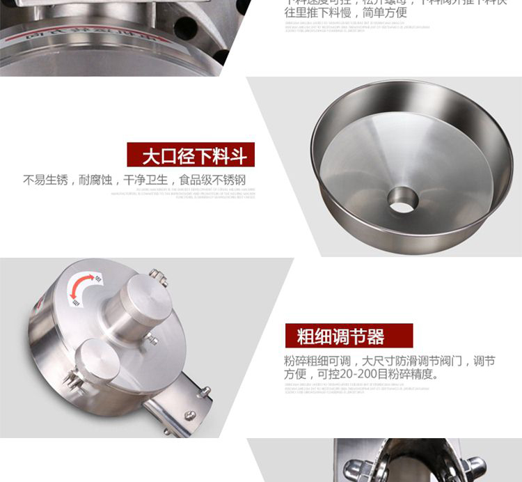 磨粉機的電機啟動運轉時,連接軸帶動連接軸上的磨盤一起運轉。待磨物料從料斗進入磨粉套,磨盤把物料帶入兩磨片中,物料經過兩磨片之后,在離心力的做用下,甩向四周,同時被裝在磨盤上的刮粉板帶下,從下料口出來。