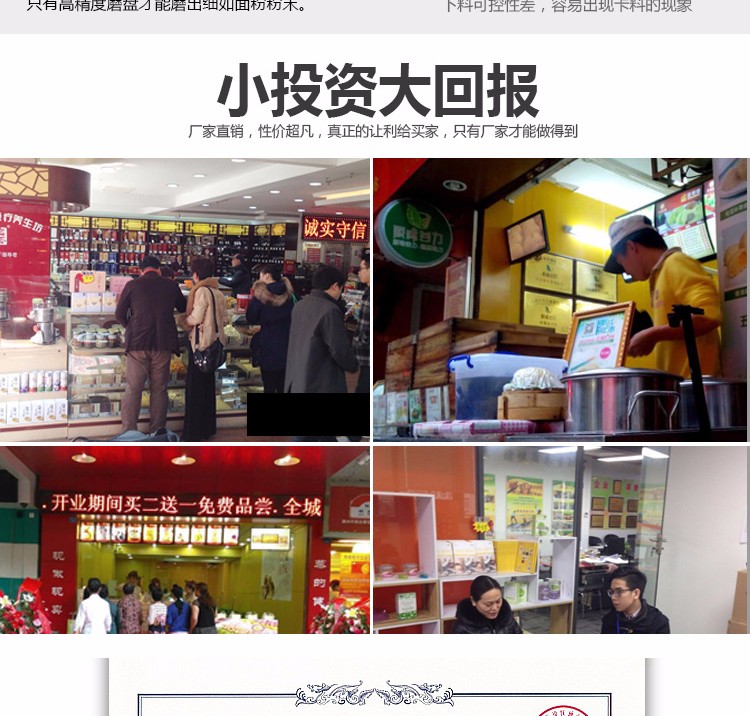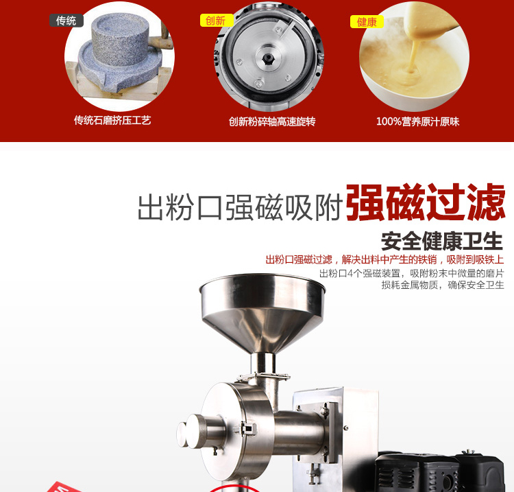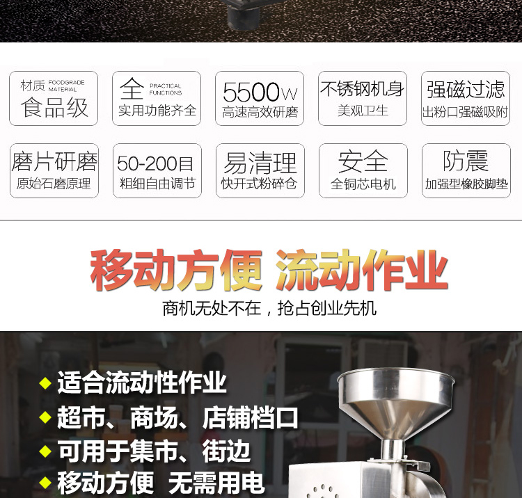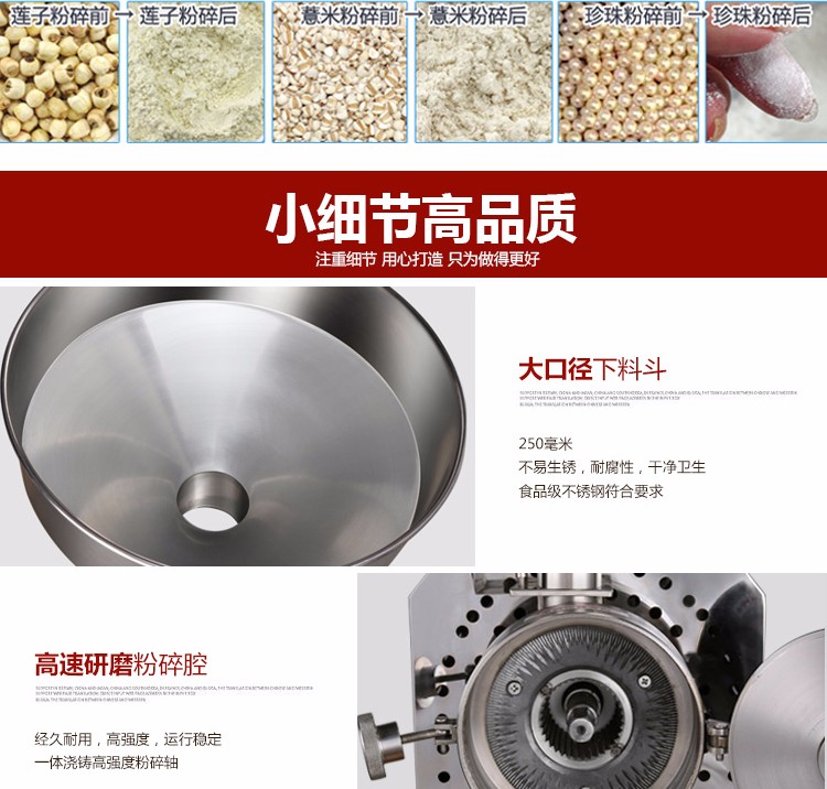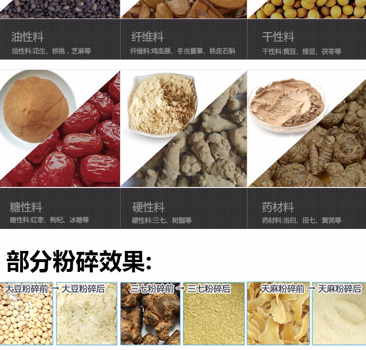 6、適用范圍更廣:適用于超市、商場、店鋪檔口現場加工各種五谷雜糧,和制藥加工廠、醫院診所等加工中藥材使用,特別適用流動作業。加工范圍廣: