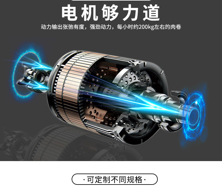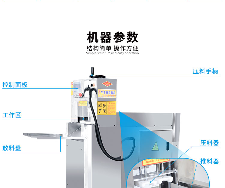 4.自動(dòng)化程度高,肉片切制,厚度調(diào)節(jié)。肉卷輸送,自動(dòng)停機(jī)。均可一鍵完成,省工省時(shí)