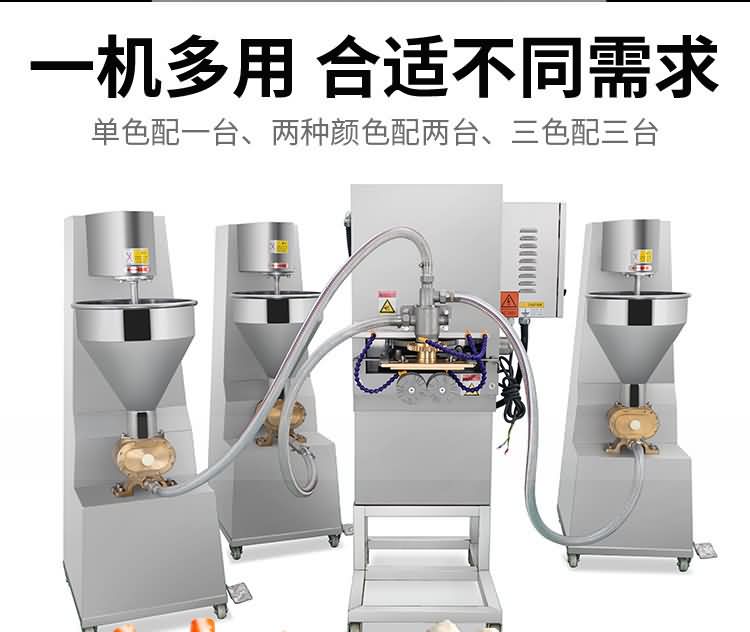 XZ-709多功能成型機新一代的多功能淡水丸機為魚肉制品成型設備,配合泵脯(供料機)使用,能生產出單色、包心及多色各種花式的品種,單色配一臺、兩種顏色配兩臺、三色配三臺。