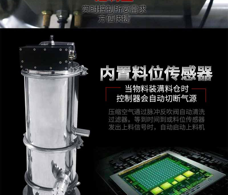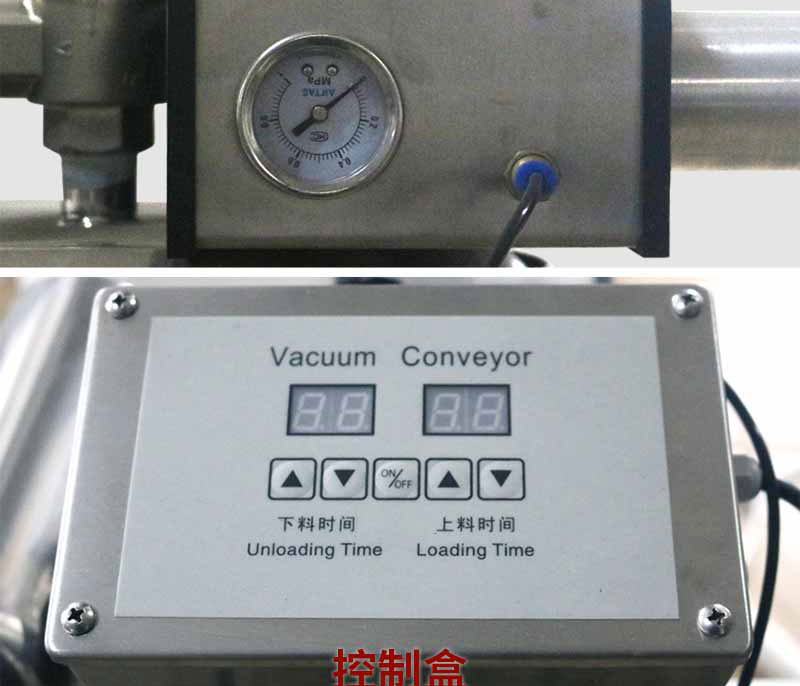 當壓縮空氣供給真空發(fā)生器時,真空發(fā)生器就產(chǎn)生負壓形成真空氣流,物料被吸入吸料咀,形成物氣流,經(jīng)過吸料管到達上料機的料倉內(nèi)。過濾器把物料與空氣分離,當物料裝滿料倉時,控制器會自動切斷氣源,真空發(fā)生器停止工作,同時料倉門自動開啟,物料落到設(shè)備的料斗中。與此同時,壓縮空氣通過脈沖反吹閥自動清洗過濾器。等到時間到或料位傳感器發(fā)出上料信號時,自動啟動上料機。