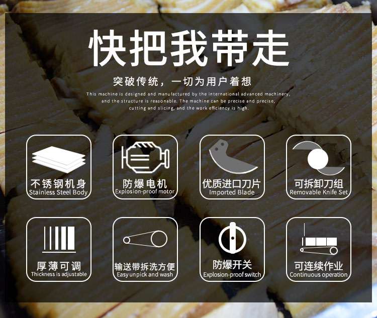 l 特制法國進口刀片,鋒利持久,二把刀片切割原理,能將叉燒肉、臘肉、五花肉、牛肉、鹵味、熟肉類以及一些根莖類蘿卜,土豆,黃瓜,蓮藕,辣椒,苦瓜,絲瓜,西葫蘆等切成片形狀;