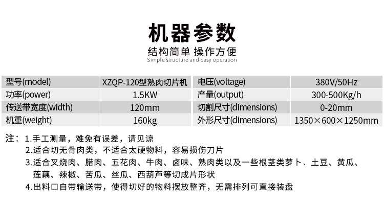 名稱XZQP-120型熟肉切片機 電源380V(220V兩相需定制) 功率1.5Kw 產量300-500Kg/H 尺寸1350×600×1250mm 重量160Kg 規格1.0-20mm 其他