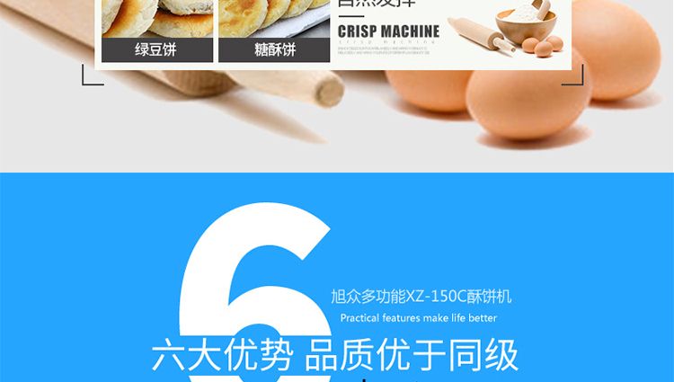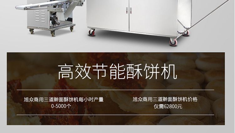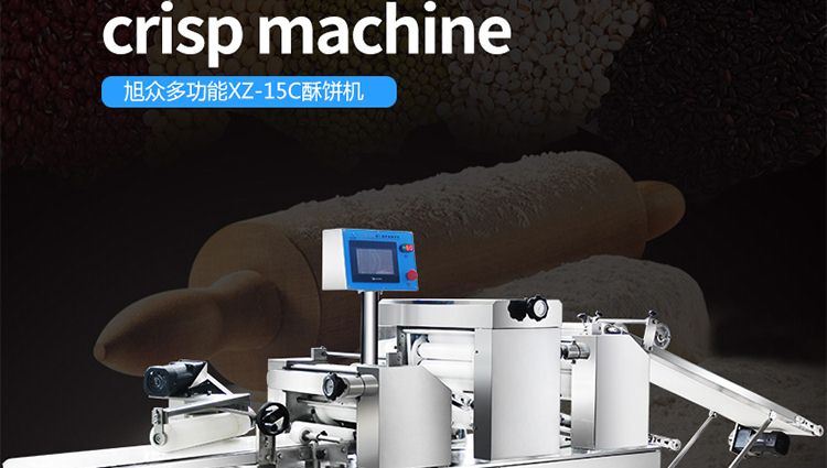 旭眾牌XZ-15C三道搟面酥餅機是我公司仿手工制作面食產品的機型,占地面積小,重量輕,它吸收國內傳統手工制作技術,即運用搟面杖壓面和打擊面團,以保證高面筋性和面帶的密度,并綜合考慮面食的口感而研發。