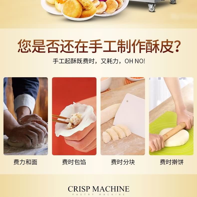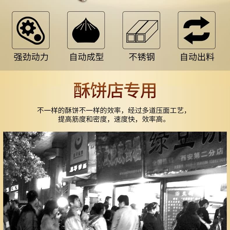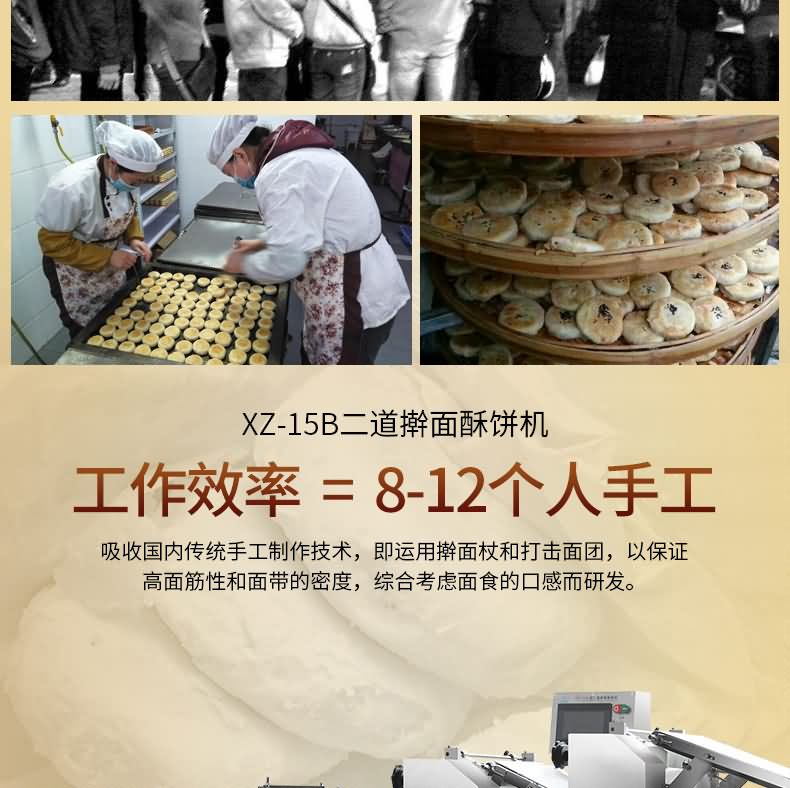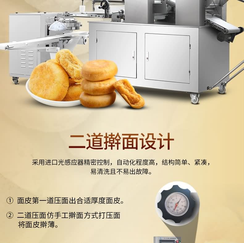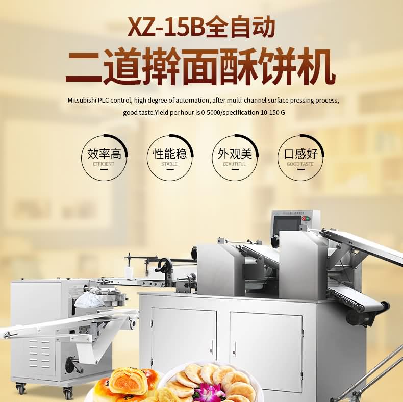 XZ-15B二道搟面酥餅機,生產(chǎn)速度快、效率高、生產(chǎn)流程流暢,各環(huán)節(jié)都輔以電控設備控制,不會出現(xiàn)堵面、破酥等現(xiàn)象。可生產(chǎn)蘇式月餅、肉松餅、老婆餅、廈門餡餅、金華酥餅、拉絲面包等等特色酥餅,適用于大、中型糕餅生產(chǎn)廠家,免費提供工藝技術。