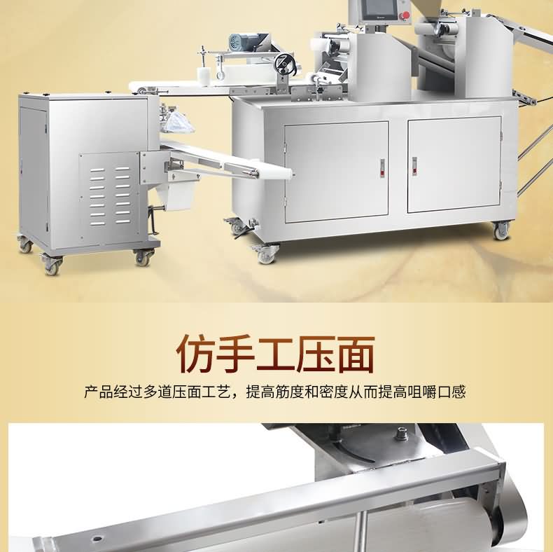 ?生產(chǎn)速度快,效率高,生產(chǎn)流程流暢,各環(huán)節(jié)都輔以電控設備控制,不會出現(xiàn)堵面,破酥等現(xiàn)象;