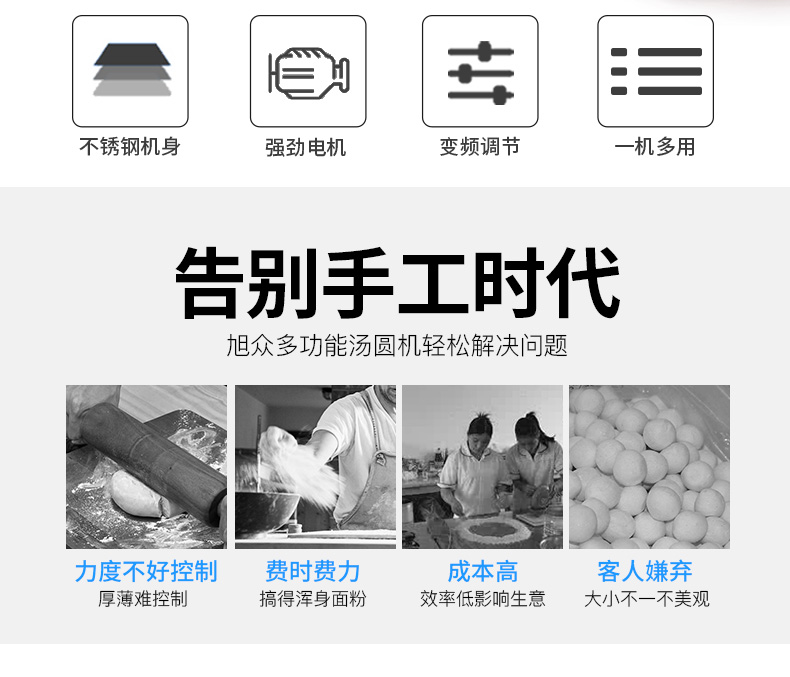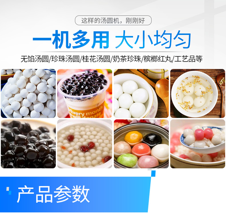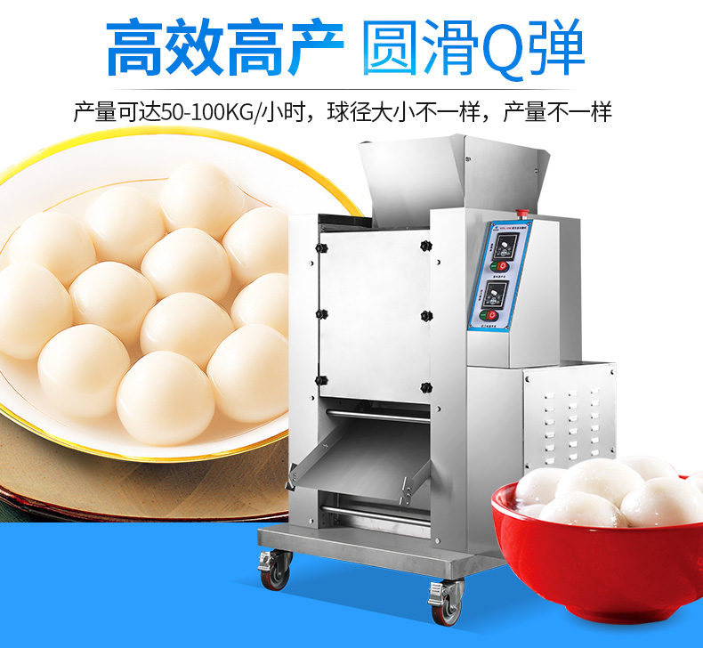 旭眾牌VFD-1200無餡湯圓機(jī)又稱珍珠湯圓機(jī)、桂花湯圓機(jī)。規(guī)格有8-22mm,每臺(tái)機(jī)一個(gè)規(guī)格,規(guī)格不同價(jià)格亦不同,可根據(jù)客戶要求訂制。湯圓機(jī)速度高,每小時(shí)可生產(chǎn)0-120kg湯圓,球徑大小不一樣,產(chǎn)量不一樣;面皮和切刀成型采用變頻調(diào)速;無餡湯圓機(jī)生產(chǎn)成品多樣化,可生產(chǎn):無餡湯圓、珍珠湯圓、桂花湯圓、珍珠粉圓、奶茶所用的珍珠、檳榔紅丸、工藝品等。