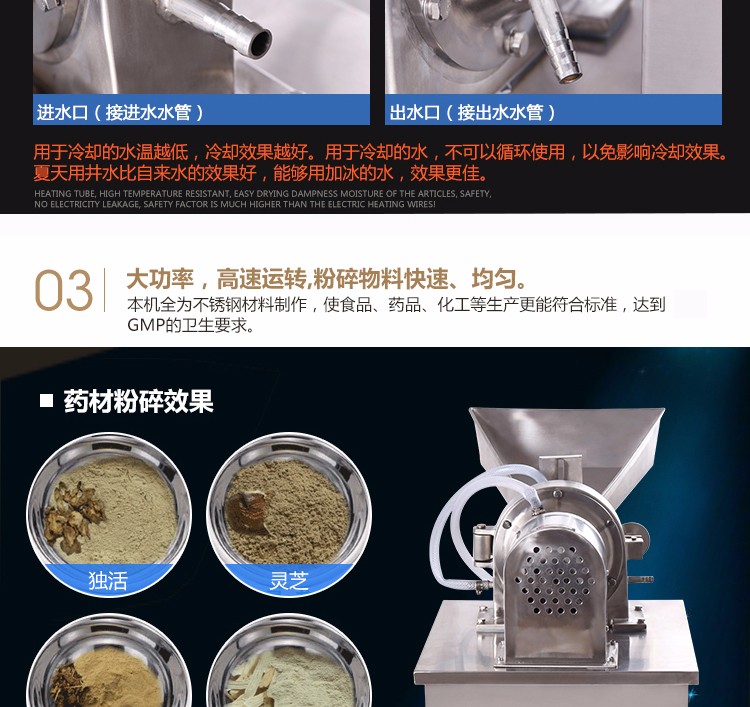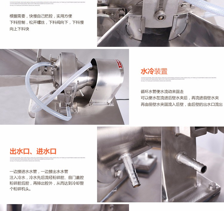 2、水冷裝置為在粉碎腔的外圈,以及粉碎腔門(mén)蓋和粉碎腔后壁,人為設(shè)置了密實(shí)的空腔,注入冷水,冷水先后流經(jīng)粉碎腔、前門(mén)蓋腔、粉碎腔后腔,再排出腔外,從而達(dá)到冷卻整個(gè)粉碎機(jī)頭,降低粉碎腔溫度的目的。