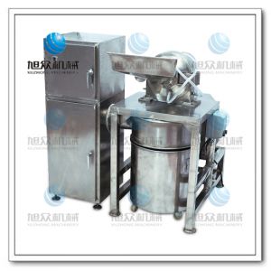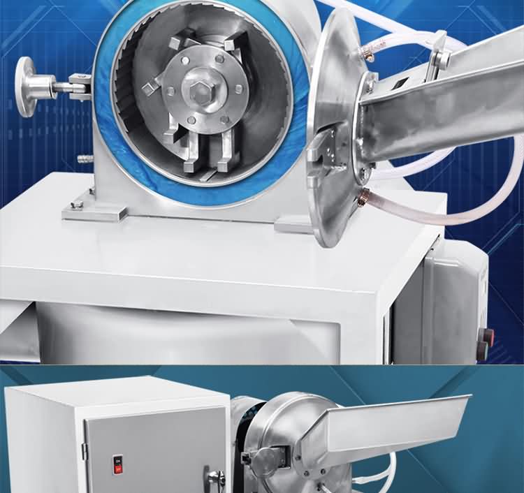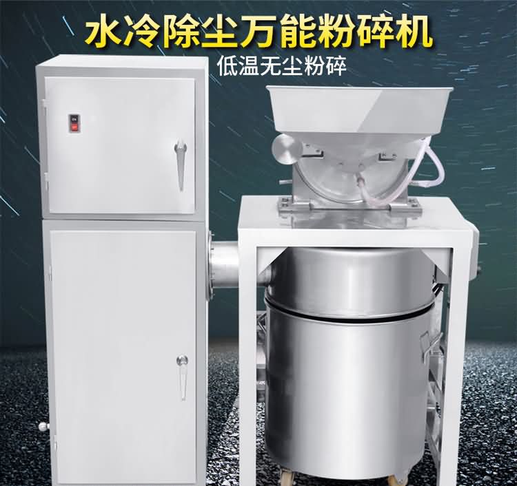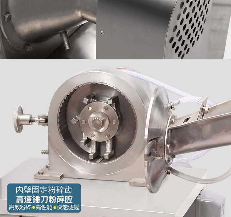 水冷多功能粉碎機(活動錘式粉碎機)利用活動小錘子高轉速旋轉和利用離心力甩打的形式,使被粉碎物經錘頭和邊沿齒輪相互沖擊、摩擦等綜合作用獲得粉碎。本機結構簡單、堅固、運轉平穩、粉碎效果良好,被粉碎物可直接由主機磨腔中排出、粒度大小通過更換不同孔徑的網篩獲得,另外該機為全不銹鋼。機殼內壁全部經機加工達到表面平滑,改變了以前機型內壁粗糙、積粉的現象,使藥品、食品、化工等生產更符合標準,達到GMP的要求。