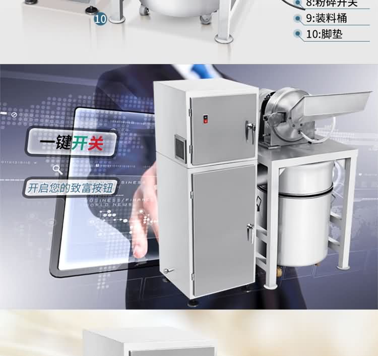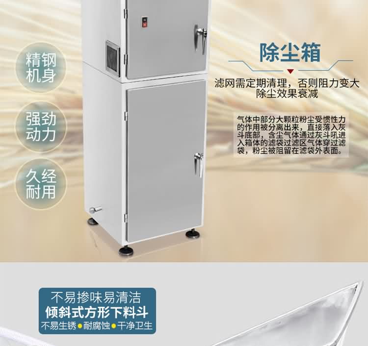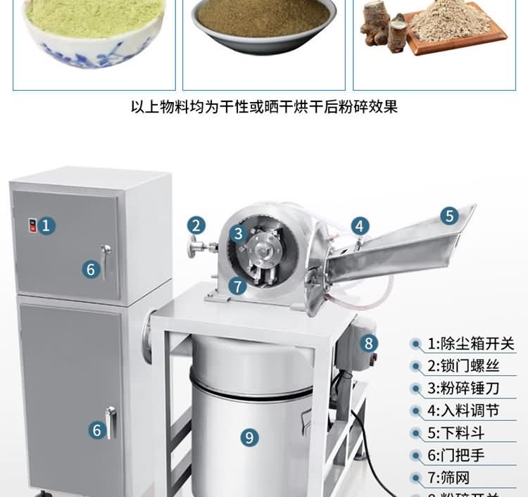 本機配備篩網,篩網可以根據客戶要求進行更換,當物料被粉碎到小于篩孔直徑時,粉劑從篩網中出來,落入下方的集料桶內,在桶內飄揚的粉塵則通過除塵電機的作用被吸入到除塵箱內的除塵袋中過濾,空氣由風機排出室外。