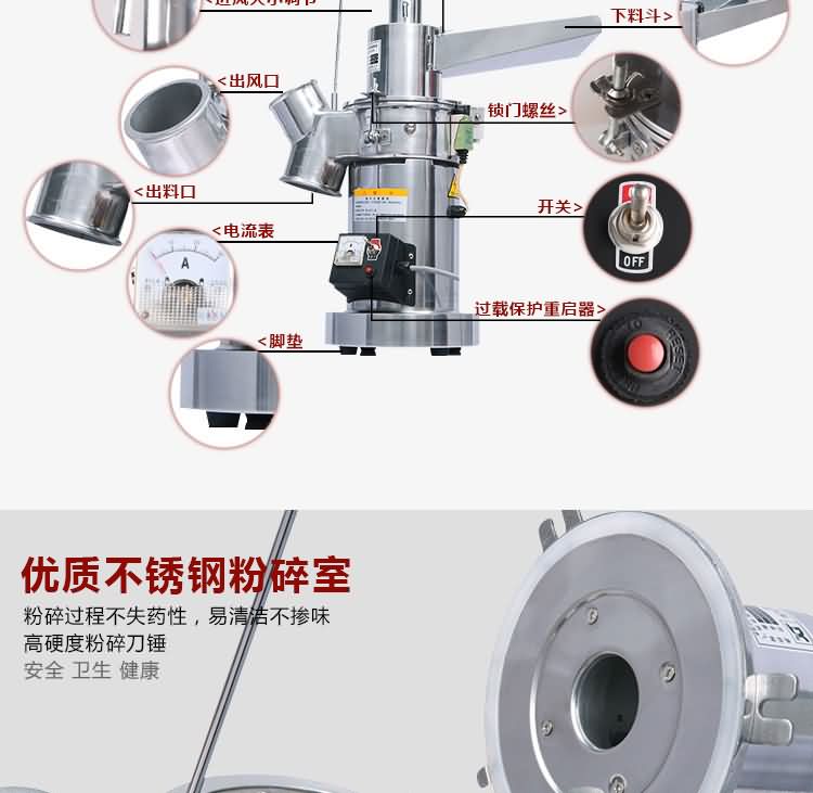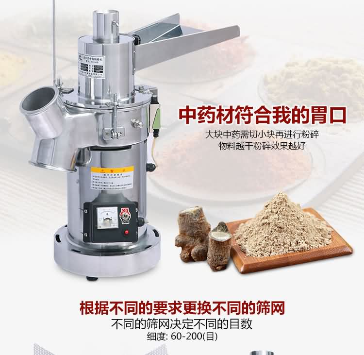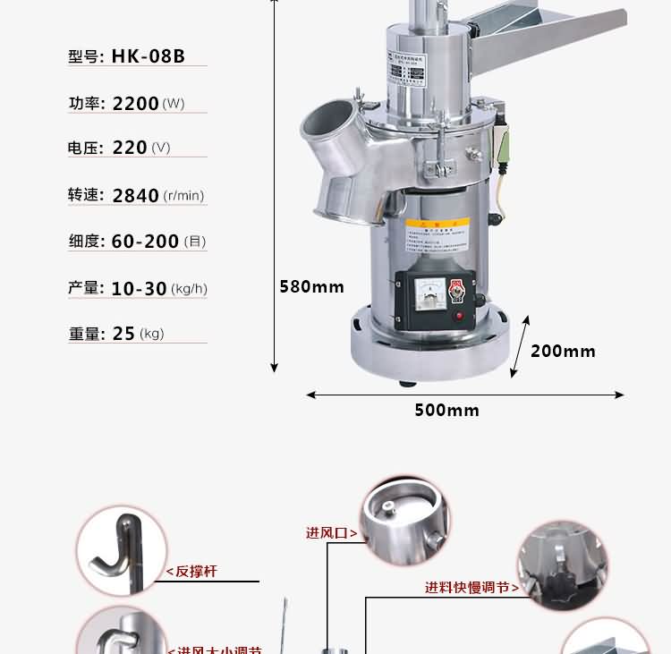 HK-08B落地流水式粉碎機(jī)又名高性能粉碎機(jī)、體積小、造型美觀、移動(dòng)方便、操作簡(jiǎn)單,特殊構(gòu)架運(yùn)轉(zhuǎn)絕無振動(dòng)、噪音最低、安全性高、性能穩(wěn)定、衛(wèi)生潔凈、損耗極低、效率高、細(xì)度準(zhǔn)確可調(diào);與藥物接觸部分用不銹鋼制作,符合衛(wèi)生標(biāo)準(zhǔn),除制細(xì)粉外,還可制煎湯劑用的粗顆粒飲片(用粗顆粒飲片煎煮湯藥,可提高飲片有效成分的溶出率,節(jié)省大量藥材),對(duì)中西藥物、化工原料、食品原料、礦物、土壤、糧食、煤炭、實(shí)驗(yàn)原料有極理想的粉碎效果,是粉碎脆性物料的首先機(jī)型。是目前診所、藥店、醫(yī)院藥房、研究所、實(shí)驗(yàn)室、試制室、大中專院校、科研單位、商場(chǎng)、家庭粉碎的理想設(shè)備。
