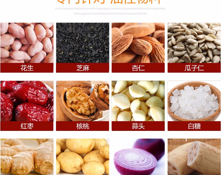 1、瓜子仁,芝麻,杏仁,紅棗,花生,核桃,白糖,蒜頭,姜,馬鈴薯,辣椒,洋蔥,蓮藕等等。