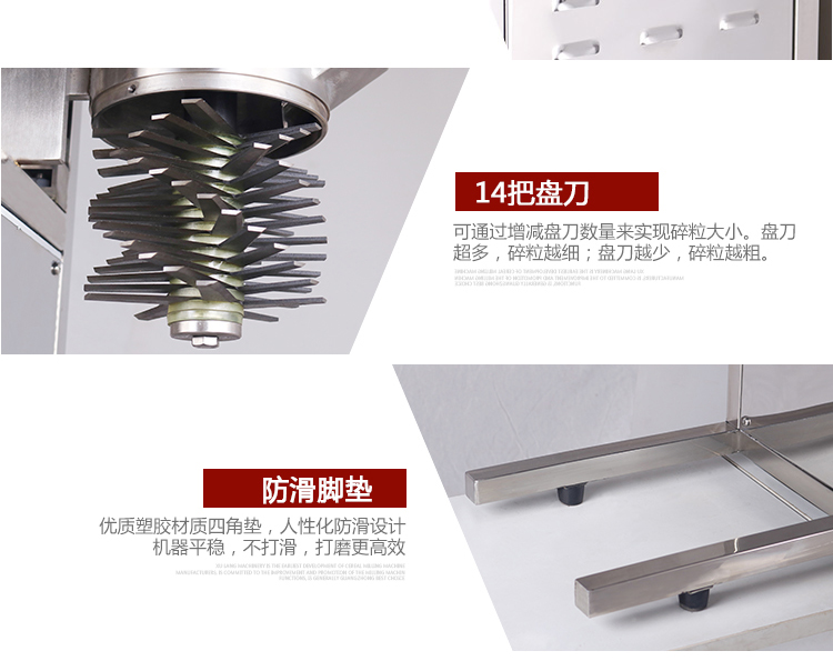 4、本機可通過增減盤刀數量來實現碎粒大小。盤刀超多,碎粒越細;盤刀越少,碎粒越粗。