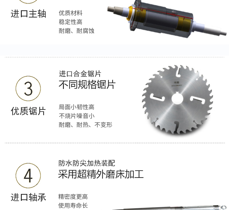 4.鋸片:征對(duì)加工材質(zhì),選用不同規(guī)格合金鋸片,耐磨、耐熱,不變形。
