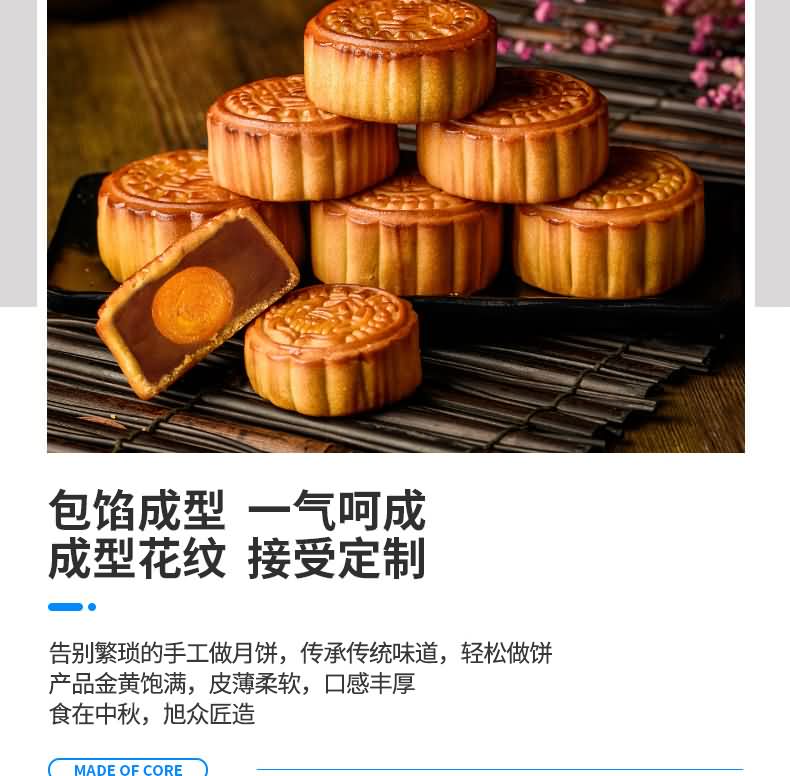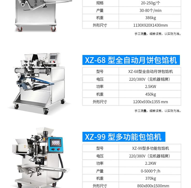 ◆可生產各種包餡食品如鳳梨酥、夾心餅、南瓜餅、軟皮老婆餅、月餅、軟餡餅干、棗泥餅、麻署、紅龜果、湯圓、芋圓、肉圓、肉派、肉餡餅、奶黃包、豆沙包、草餅、芝麻球、水晶丸等。