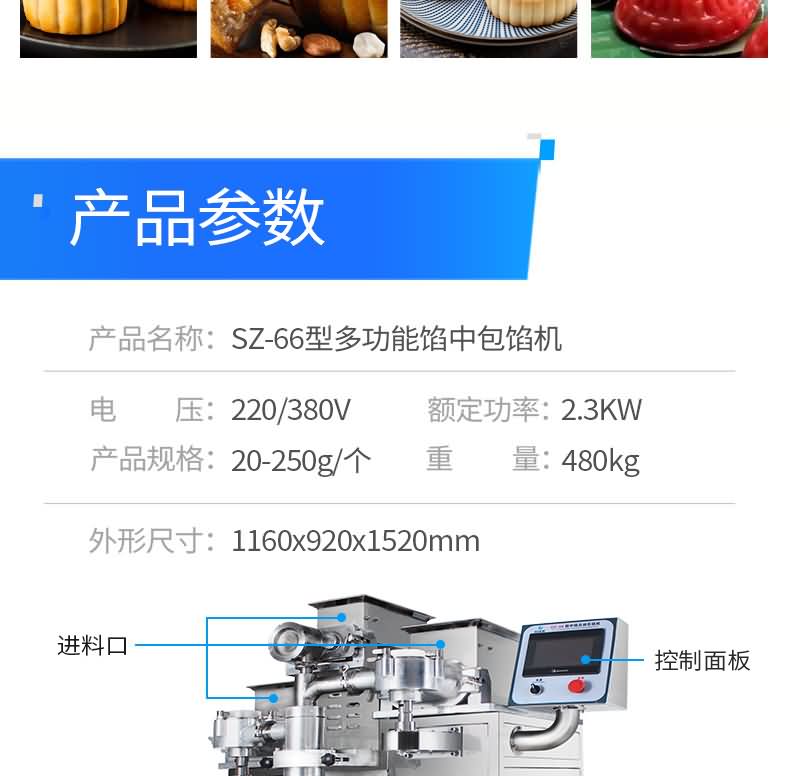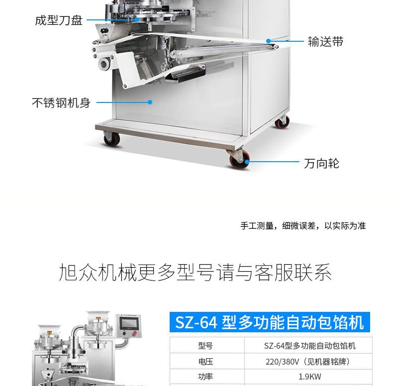 名稱SZ-66型餡中餡自動包餡機 電源220/380V 功率2.3kw 產量30-80只/min 尺寸1160×920×1520mm 重量480kg 規格20-250g/個 其他