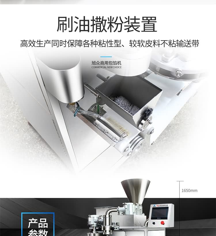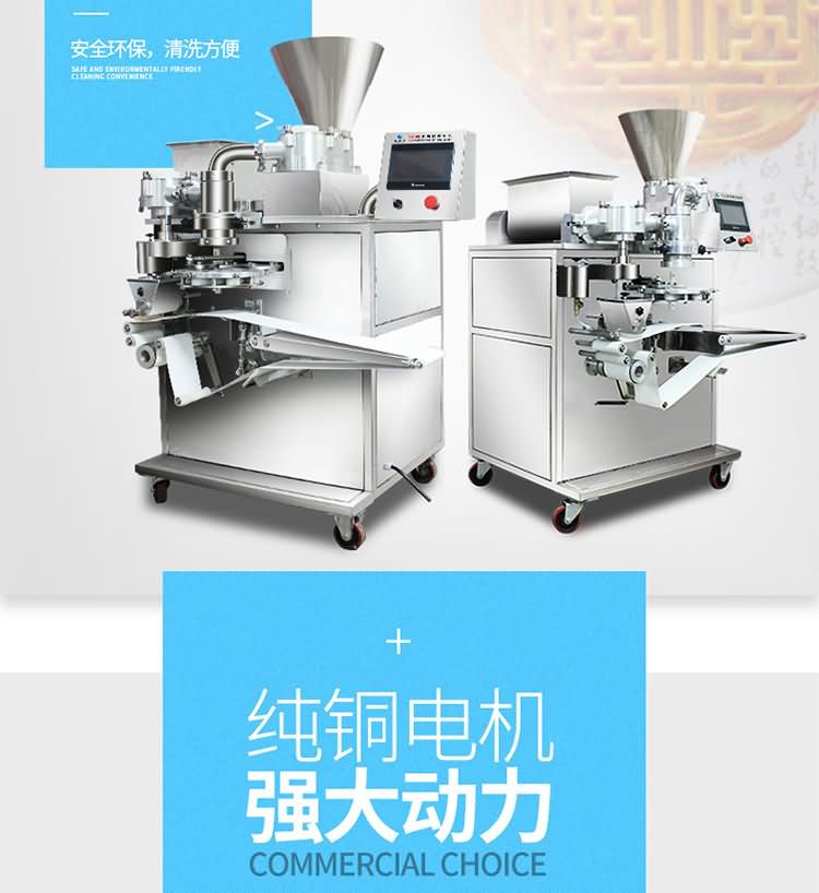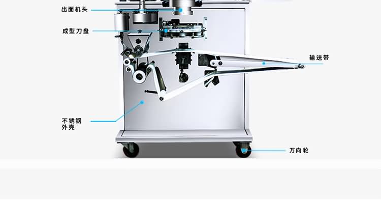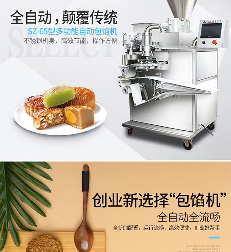 SZ-65型多功能自動包餡機采用臥式輸面、立式輸餡系統,運行流暢,效率高。可生產豆沙、蓮蓉、五仁餡等較干餡料的包餡類產品,制出的產品餡、皮比例可任意調整,制品大小統一,外形美觀。