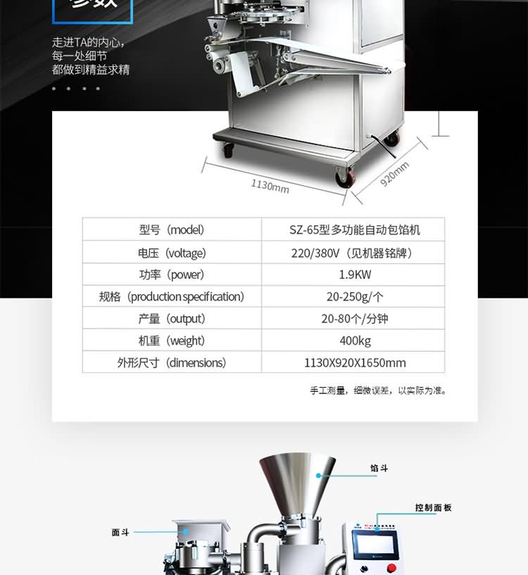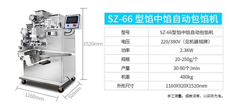 名稱SZ-65型多功能包餡機 電源220/380V 功率1.9kw 產量20-80個/分鐘 尺寸1130×920×1650mm 重量400kg 規格20-250克/個 其他皮餡比例2:8 5:5