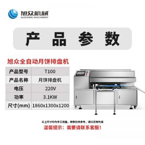 旭眾智能T100排盤機是月餅機,包子機,酥餅機,糍粑機,等需排盤的食品生產線伴侶,多樣化排盤方式可在機器觸摸屏一鍵操作,標準橫式排盤,交叉排盤,長條排盤,一次性可放不粘烤盤120個,帶孔烤盤約200個,實現降低人工成本,增加生產速度,加大利潤增長,功能強大,機器操作簡單。