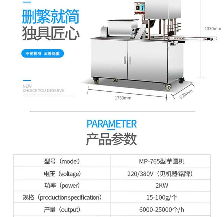 MP765型芋圓機(jī)是可生產(chǎn)出不同規(guī)格不同型號(hào)芋圓、地瓜圓、紫薯圓、仿長(zhǎng)方形糍粑等產(chǎn)品的設(shè)備