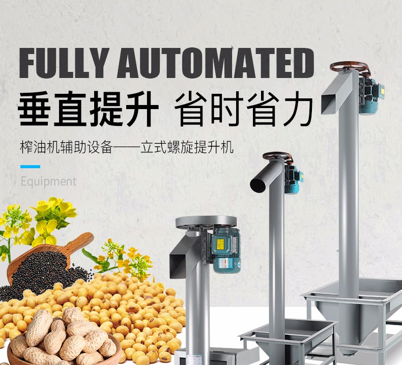 立式螺旋提升送料機,該系列設備主要針對糧食作物,用于玉米,小麥,飼料,花生,菜籽,大豆,芝麻,白糖,種子,大米,小米等小顆粒生上料輸送,工作時將粉狀或顆粒狀及較大的物料直接從儲料箱自動送入到料斗內,并由料位器控制加料循環,實現加料自動化。輸送過程中原料不受污染,不帶入任何異物。該機器主要和榨油機、飼料機配套使用,減少粉塵、減輕勞動強度,提升勞動效率。料口有圓形或方形可選。