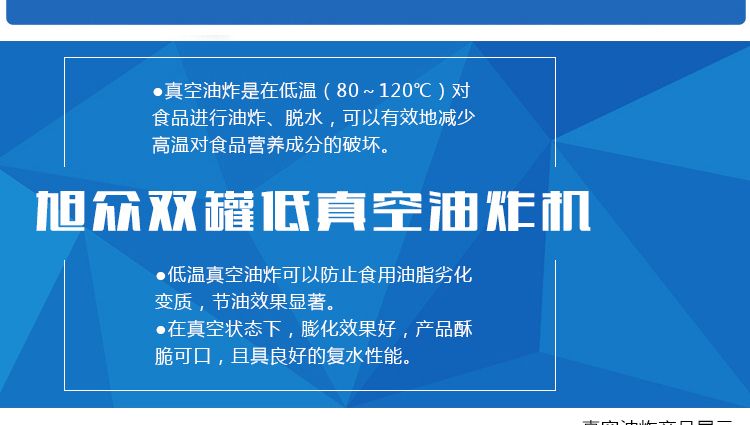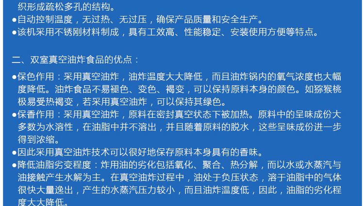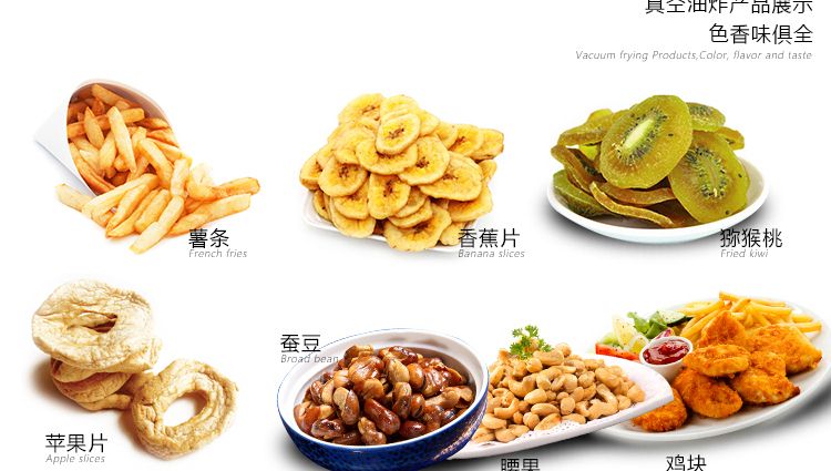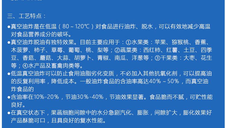 ●真空油炸是在低溫(80~120℃)對食品進行油炸、脫水,可以有效地降低高溫對食品營養成分的破壞。