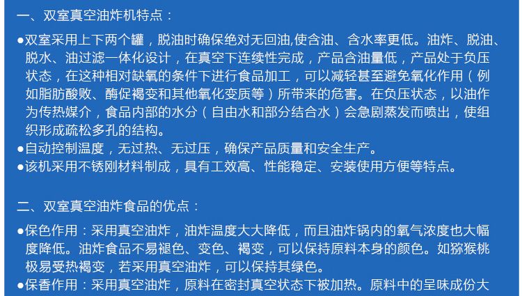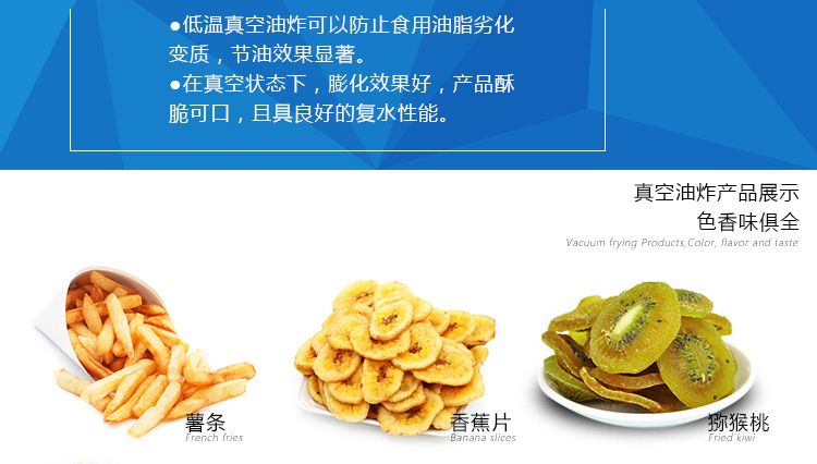 ●真空油炸是在低溫(80~120℃)對食品進行油炸、脫水,可以有效地減少高溫對食品營養成分的破壞。