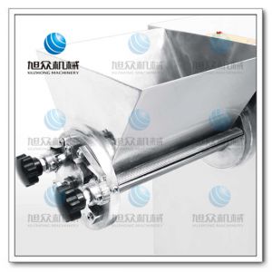 搖擺式顆粒機主要由加料斗、滾軸、篩網和機械傳動系統等組成。它工作時,機械傳動系統帶動滾筒轉動,滾筒上有七根截面形狀為梯形的“刮刀”,滾筒下面緊貼著帶有用輪的管夾夾緊的篩的篩網。成團的物料由加料斗加入,由于滾筒正反向旋轉而刮刀對濕物料產生擠壓和剪切作用。將物料擠過篩網成粒。